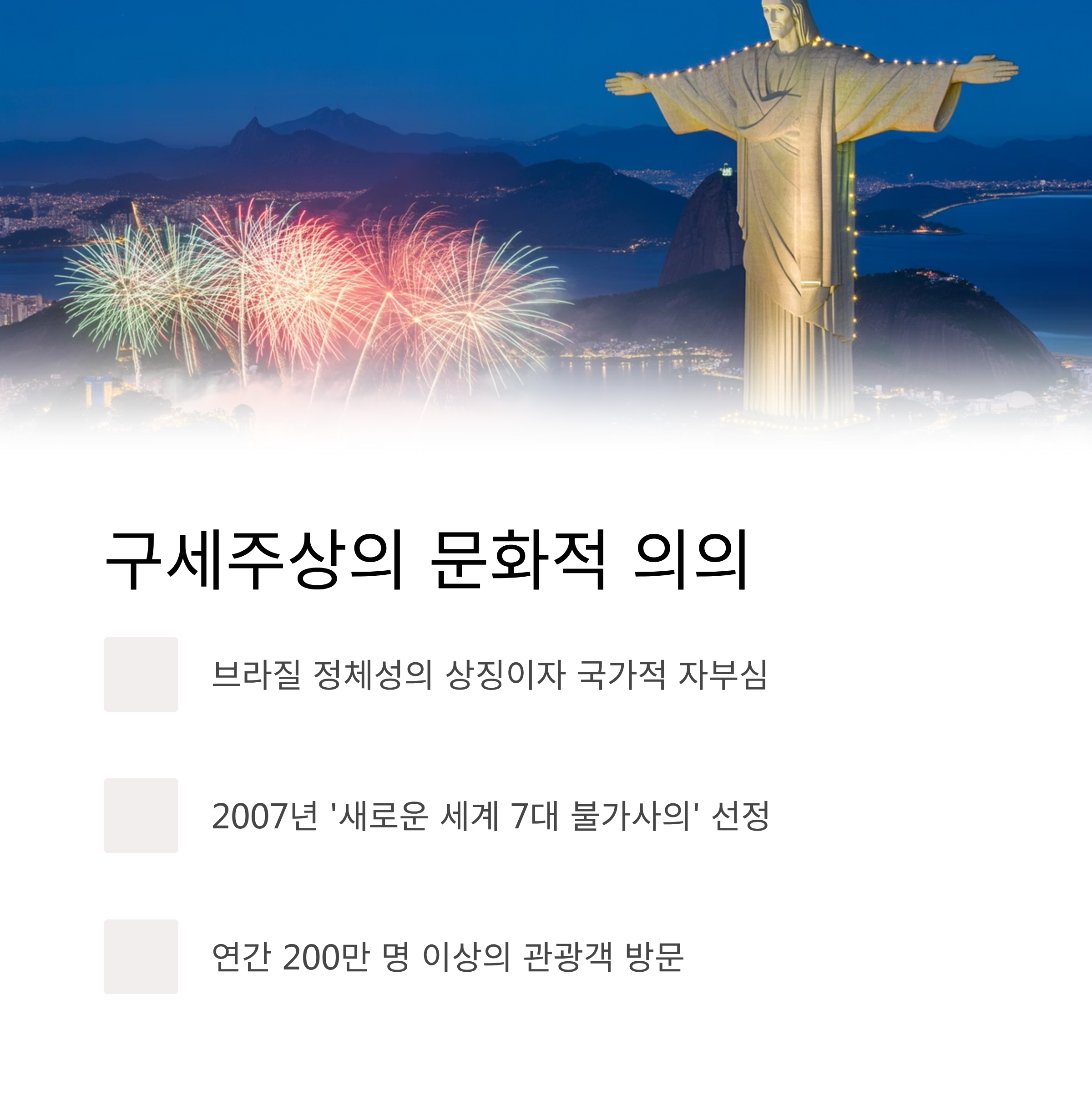 | 신앙심의 상징 | 브라질 국민의 깊은 가톨릭 신앙심과 정신적 위안 | 국민적 자부심이자 종교적 랜드마크 |