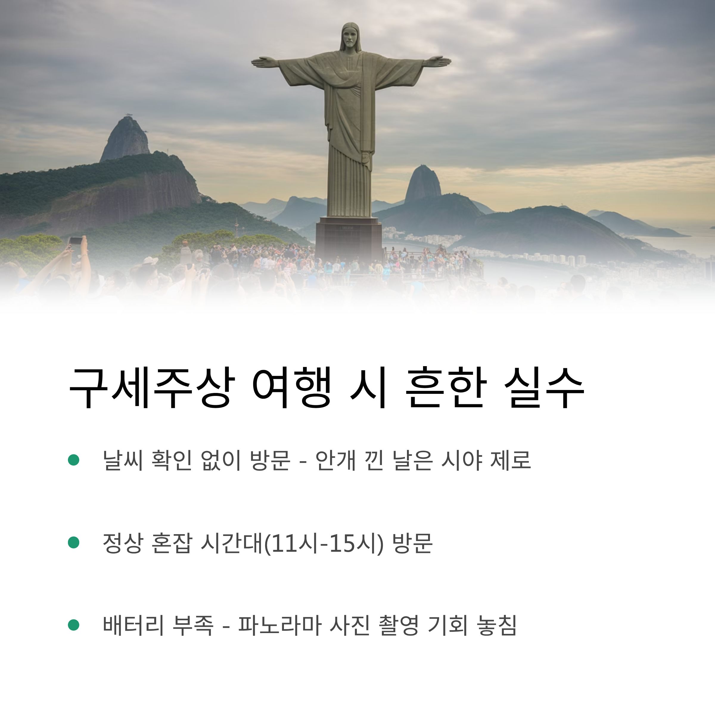 | 날씨/시야 미확인 | 조각상 안 보임, 경관 감상 불가, 여행 실망 | 방문 직전 웹캠/날씨 앱으로 정상 시야 확인 필수 |