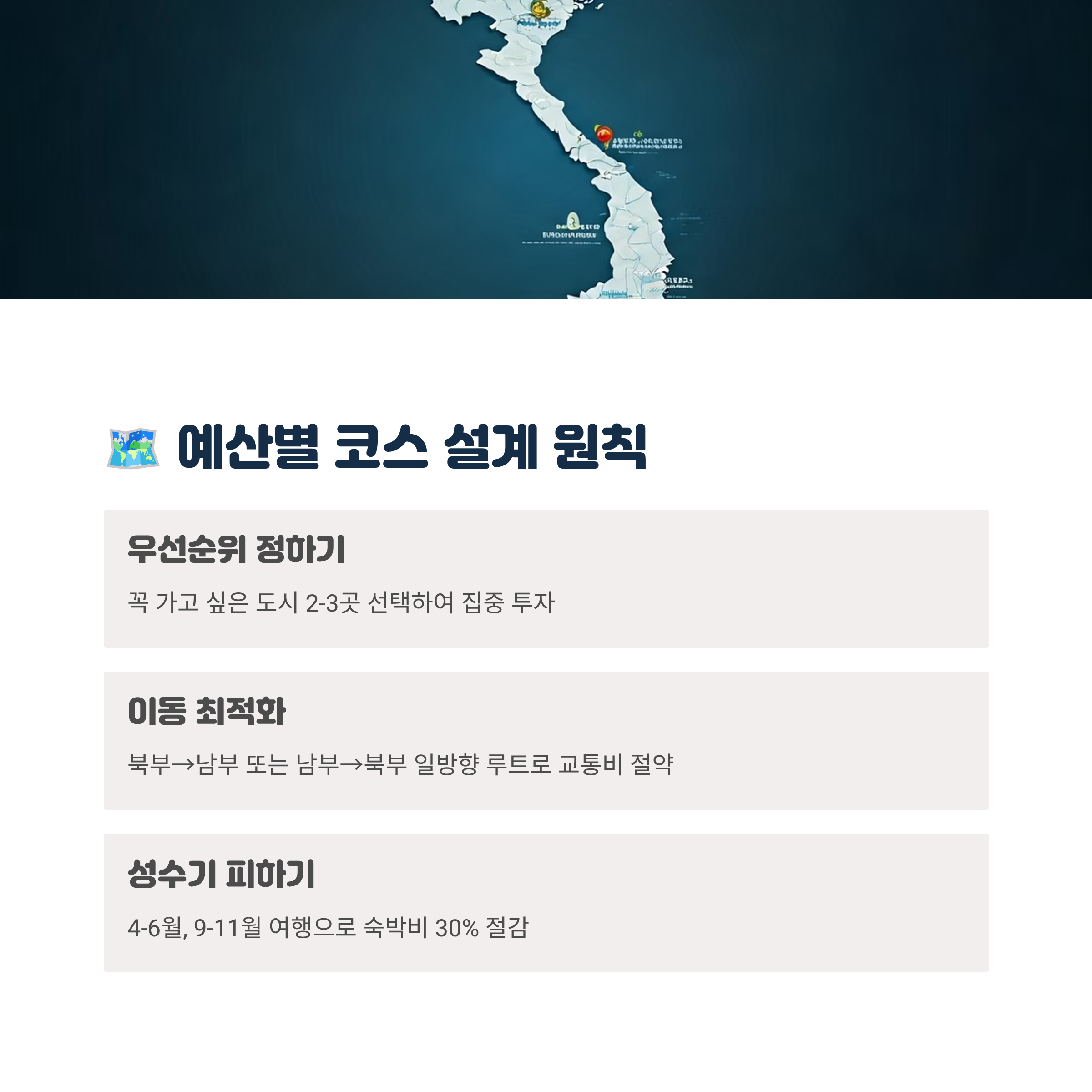 7박8일이라는 한정된 기간과 예산 안에서 베트남의 다양한 매력을 만끽하려면, 효율적인 코스 설계 원칙을 세우는 것이 중요해요. 다음 원칙들을 참고해 보세요. 🗺️