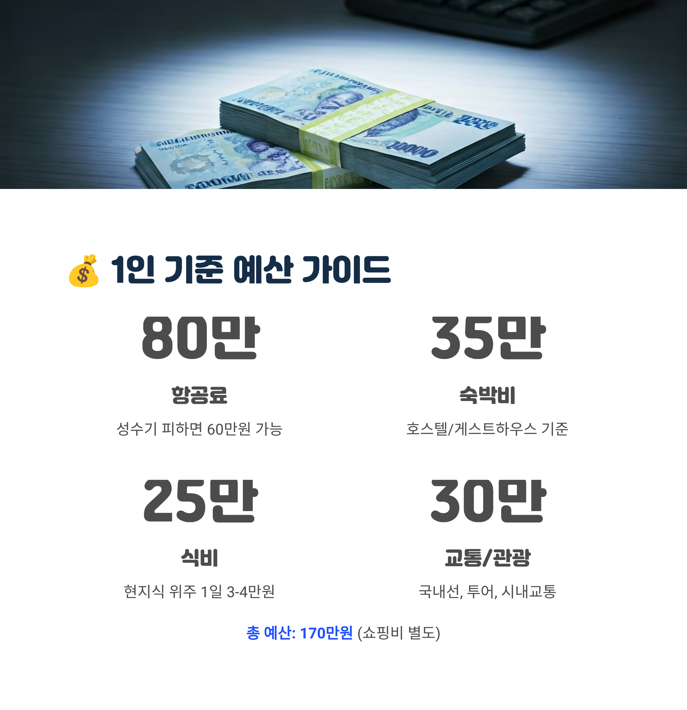 | 국내 이동 (항공) | 80–170 | LCC 특가 기준 (국제선 별도) |