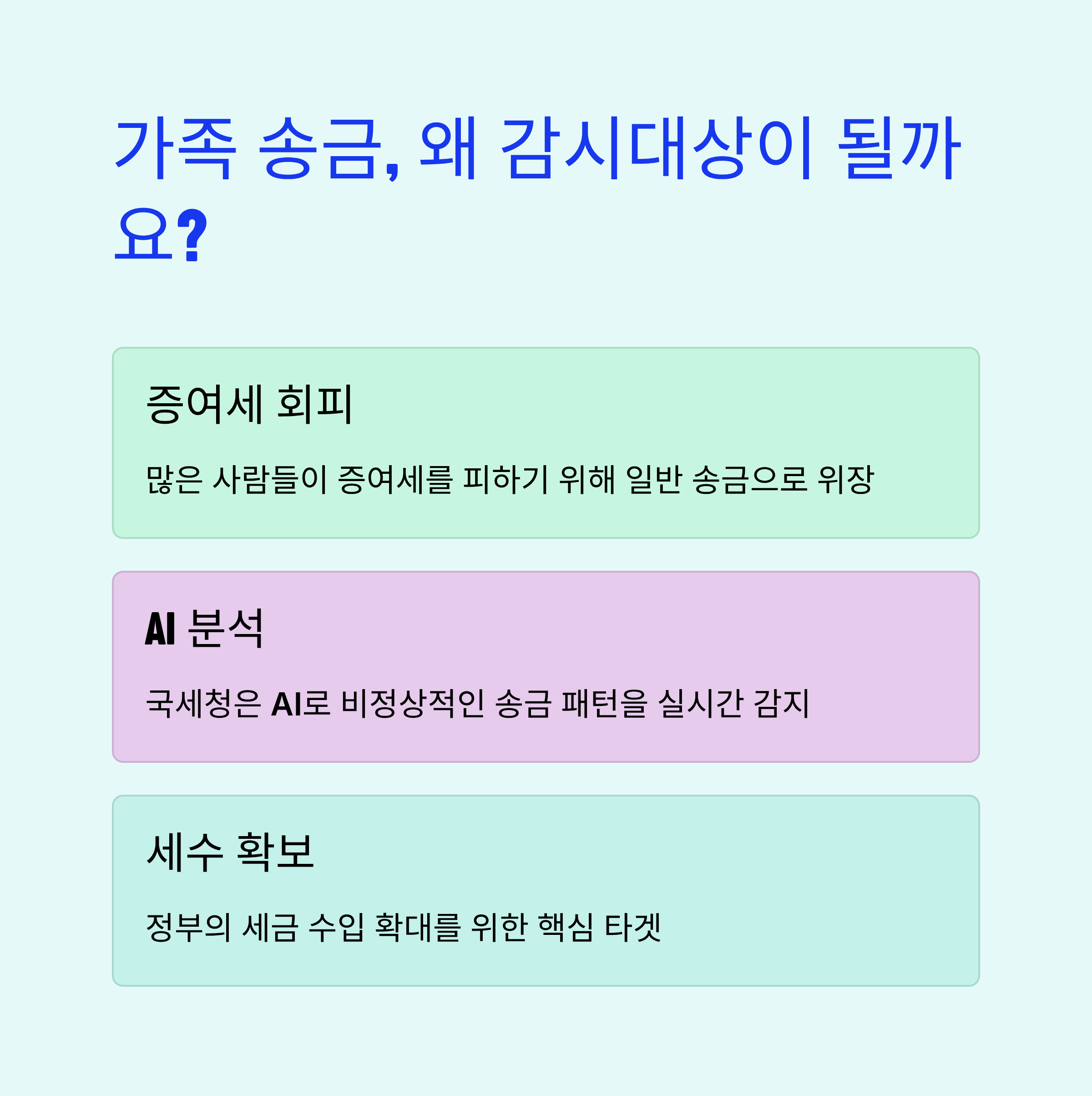 가족 간의 송금은 일상적인 거래처럼 보이지만, 국세청의 입장에서는 '증여세' 탈루 또는 '자금 출처 불분명'의 가능성을 내포하고 있습니다. 즉, 세금을 내지 않고 부(富)를 편법적으로 이전하는 수단으로 악용될 수 있기 때문에 지속적으로 감시하는 것입니다.