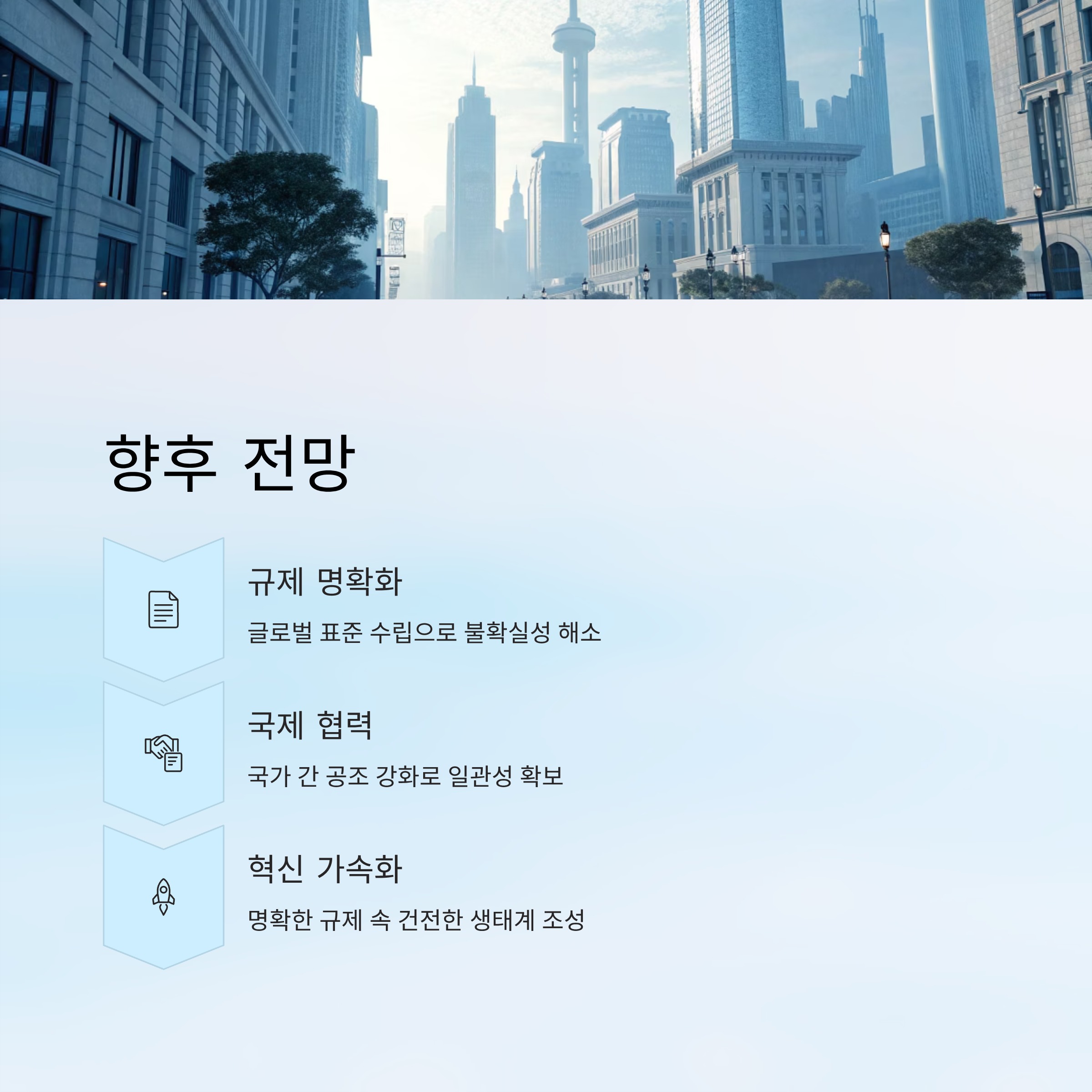 - 단계적/위험 기반 규제: 기술 혁신을 저해하지 않으면서도 위험을 관리하기 위해 EU AI 법처럼 '위험 기반 접근 방식'이 더욱 확산될 것입니다. 또한, 국내 가상자산법처럼 1단계, 2단계 등 단계적으로 규제 체계를 마련하는 방식도 보편화될 수 있습니다.