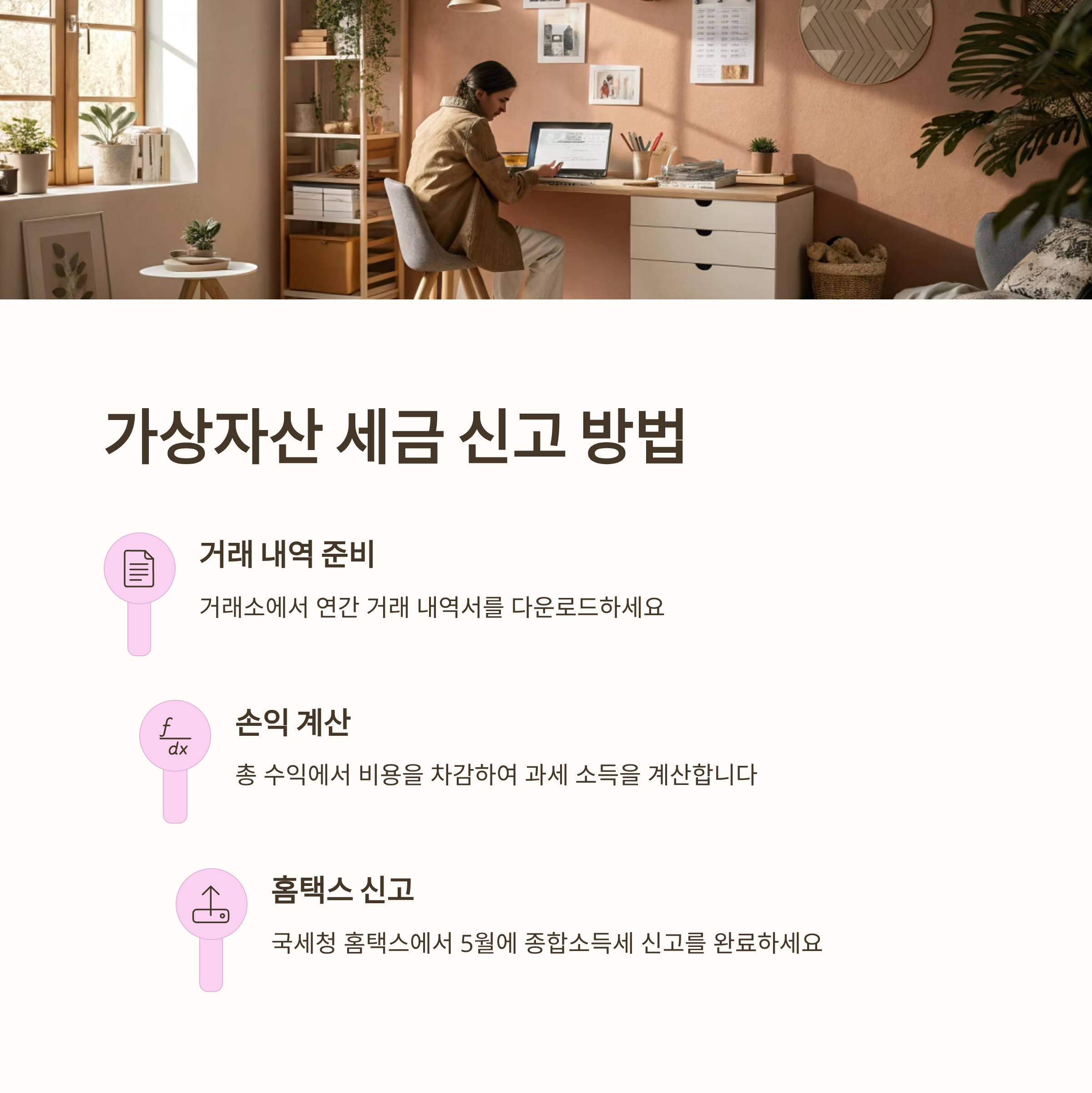 가상자산 투자 소득은 매년 5월 종합소득세 신고 기간에 '기타소득'으로 신고해야 합니다. 국내 거래소를 이용했는지, 해외 거래소를 이용했는지에 따라 준비 과정이 다를 수 있습니다.