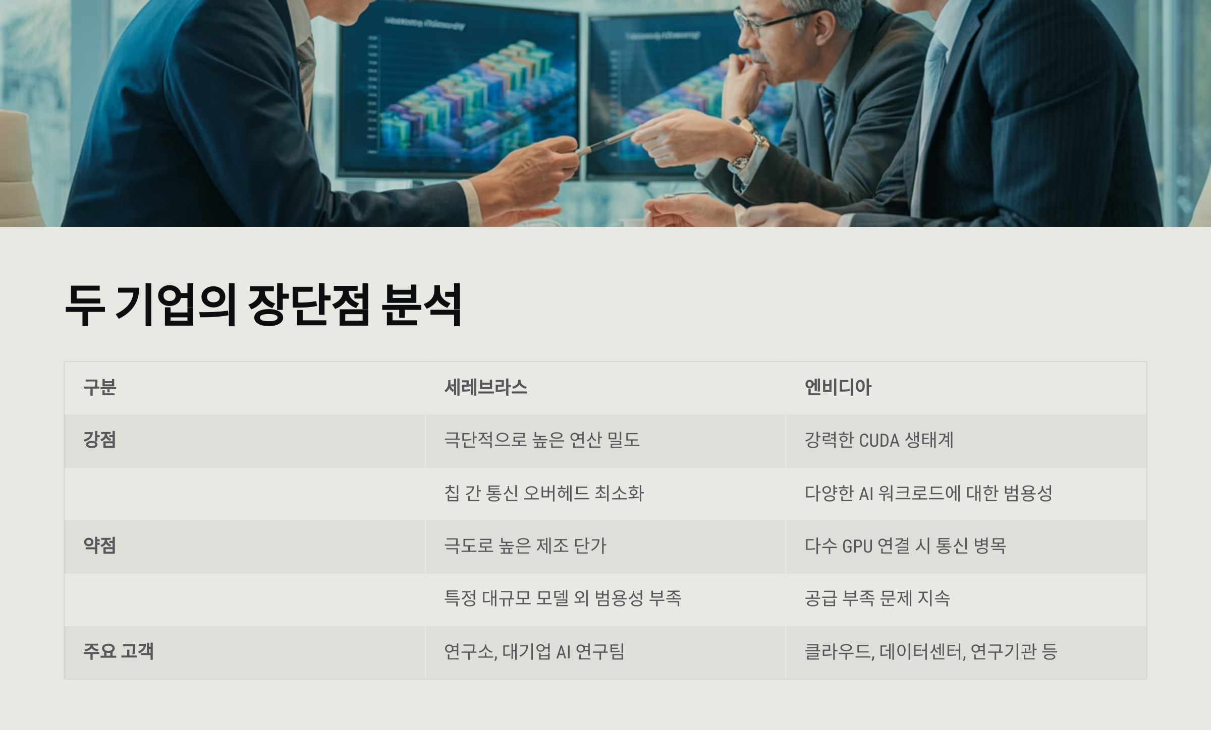 | 약점 | - 극도로 높은 제조 단가 및 수율 관리의 어려움 - 특정 대규모 AI 모델 학습 외 범용성 부족 가능성 - 상대적으로 작은 생태계 및 고객 기반 |