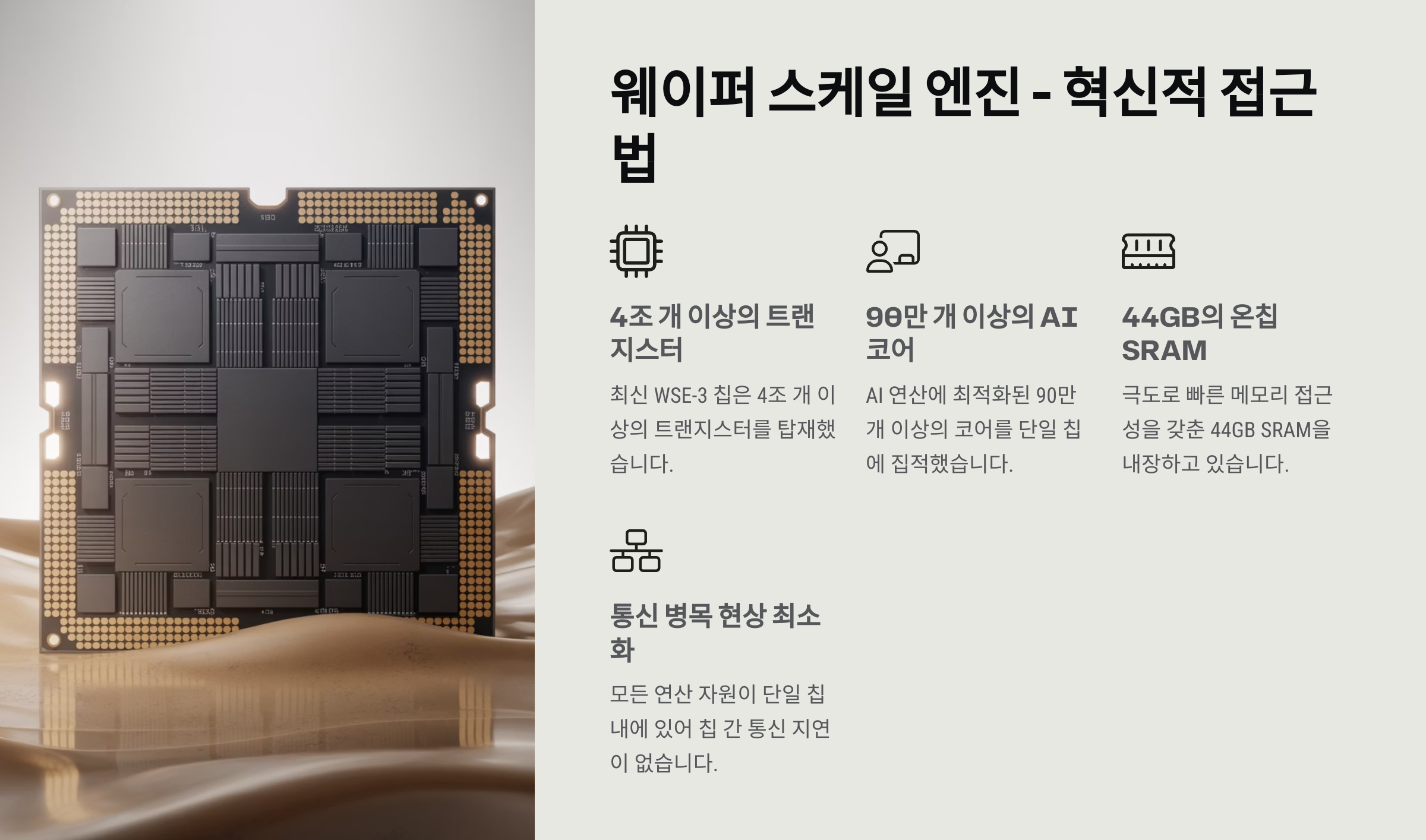최신 WSE-3 칩의 경우, 4조 개 이상의 트랜지스터와 90만 개 이상의 AI 최적화 코어, 44GB의 온칩 SRAM을 단일 칩에 집적했습니다. 이는 현존하는 어떤 GPU보다도 압도적인 규모입니다. 이러한 거대한 칩은 다음과 같은 장점을 제공합니다.