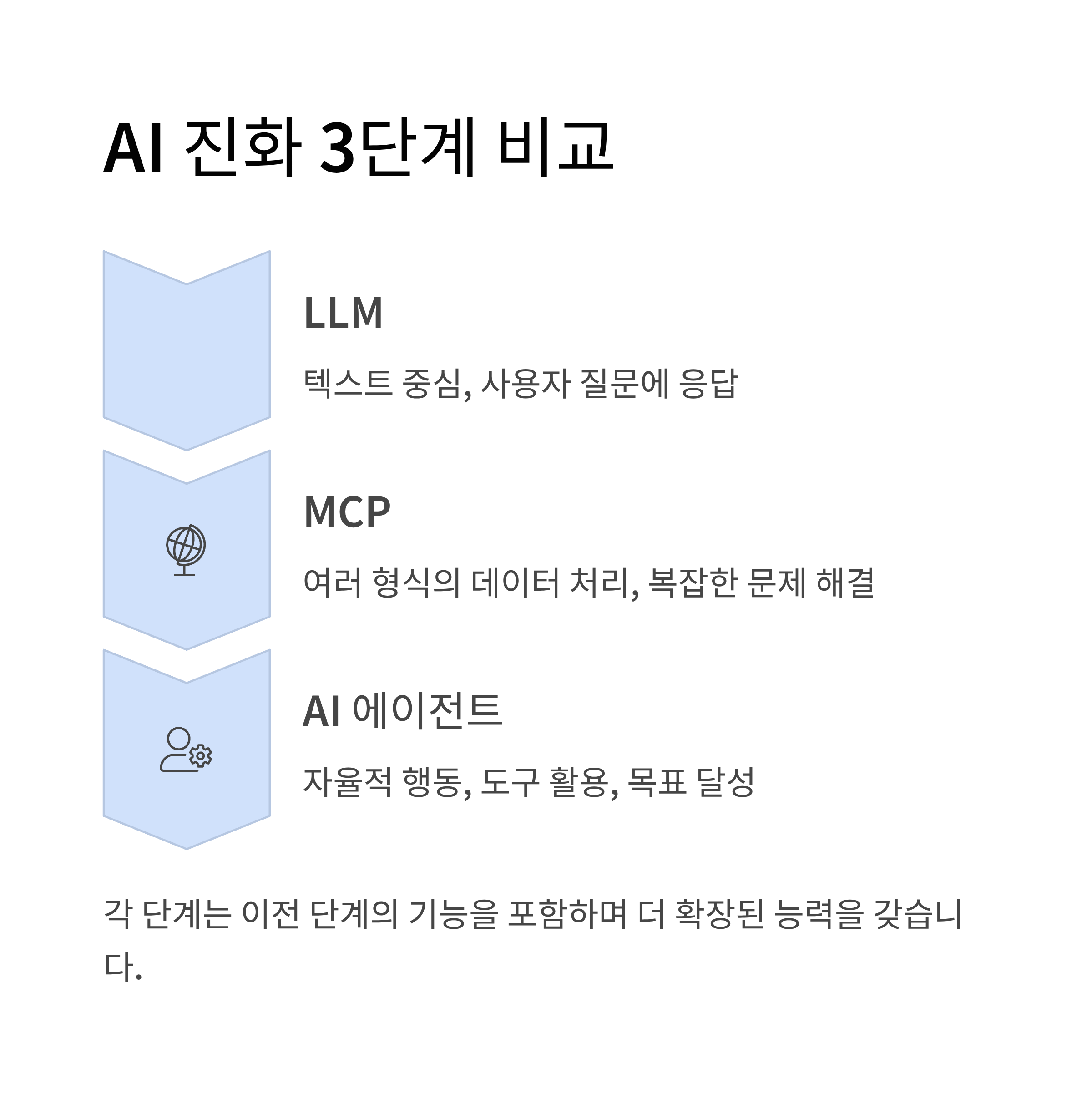 LLM이 언어에 특화되어 있다면, MCP는 '다중 모드(Multi-modal) 이해'와 '복합적인 문제 해결 능력'으로 AI의 인지 능력을 한 단계 확장합니다. 2025년 현재, 우리는 이 단계로 진입하고 있습니다.