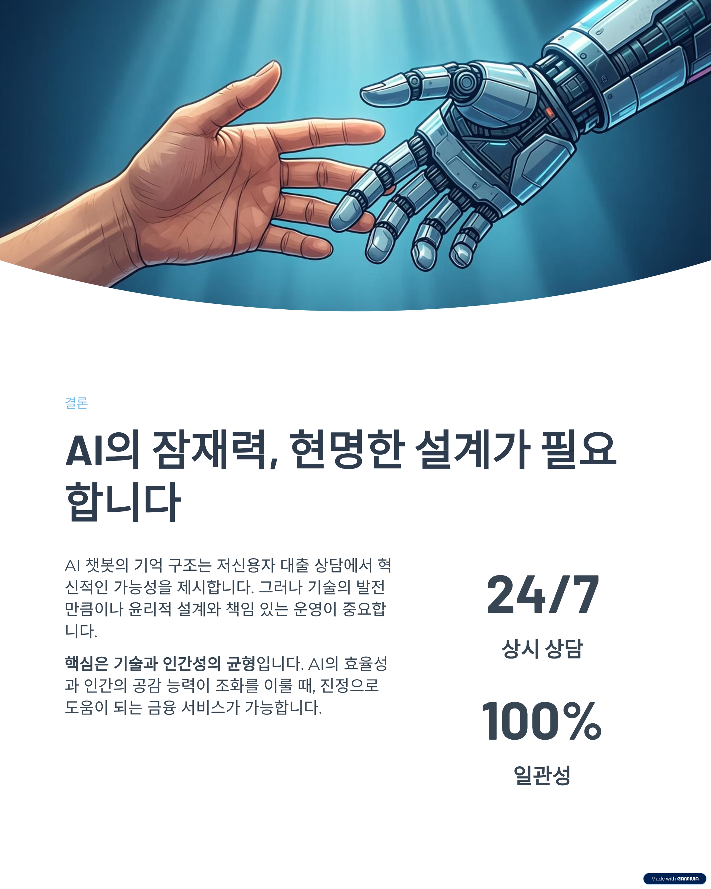 - AI 챗봇은 만능이 아닙니다. 복잡하거나 민감한 상황, 또는 사용자가 감정적으로 힘들어할 때는 AI의 한계를 인지하고 인간 상담원에게 원활하게 연결하는 시스템이 반드시 필요합니다.
