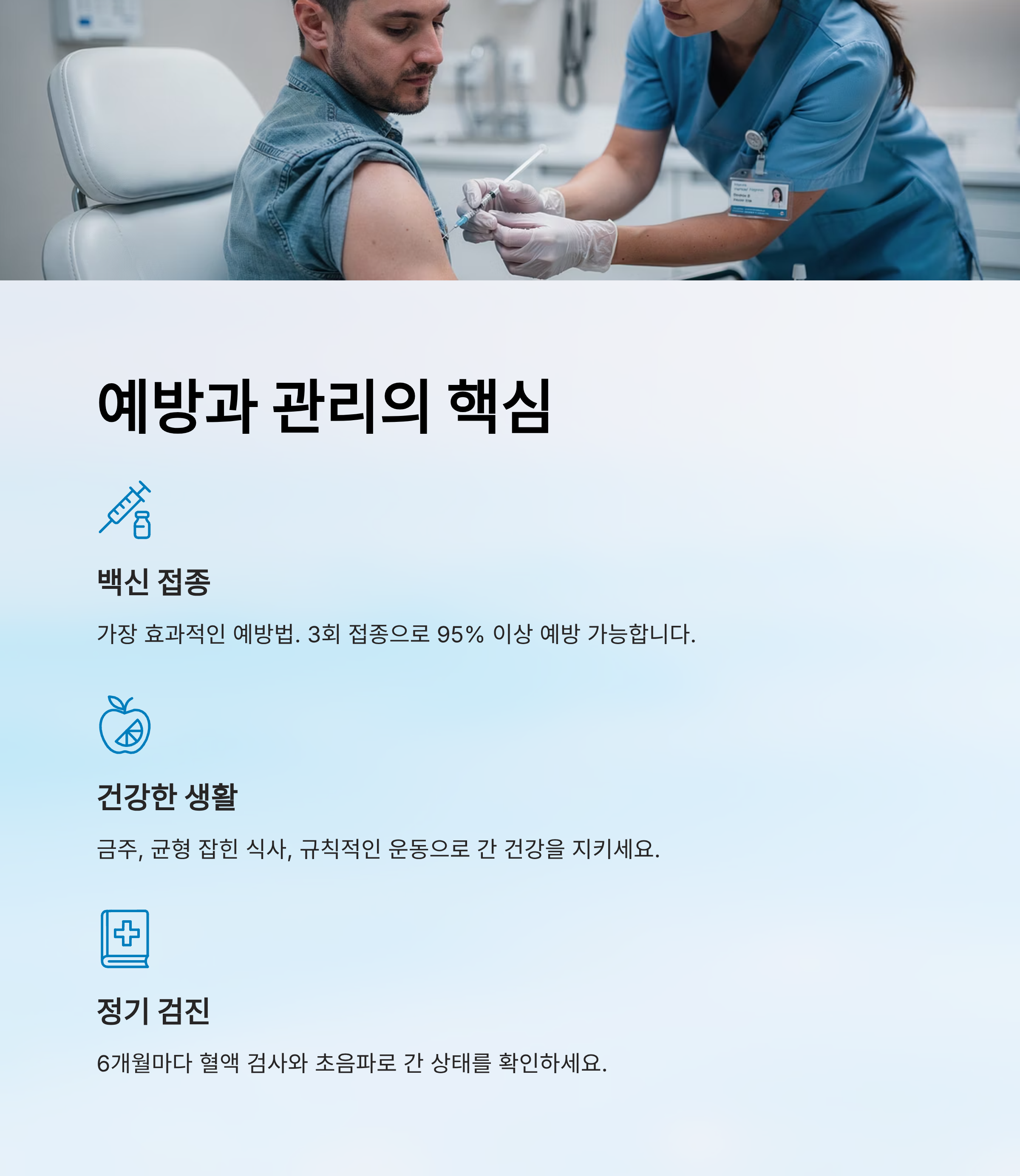 B형 간염은 예방 접종과 안전한 생활 습관을 통해 충분히 예방할 수 있는 질환입니다. 🔬