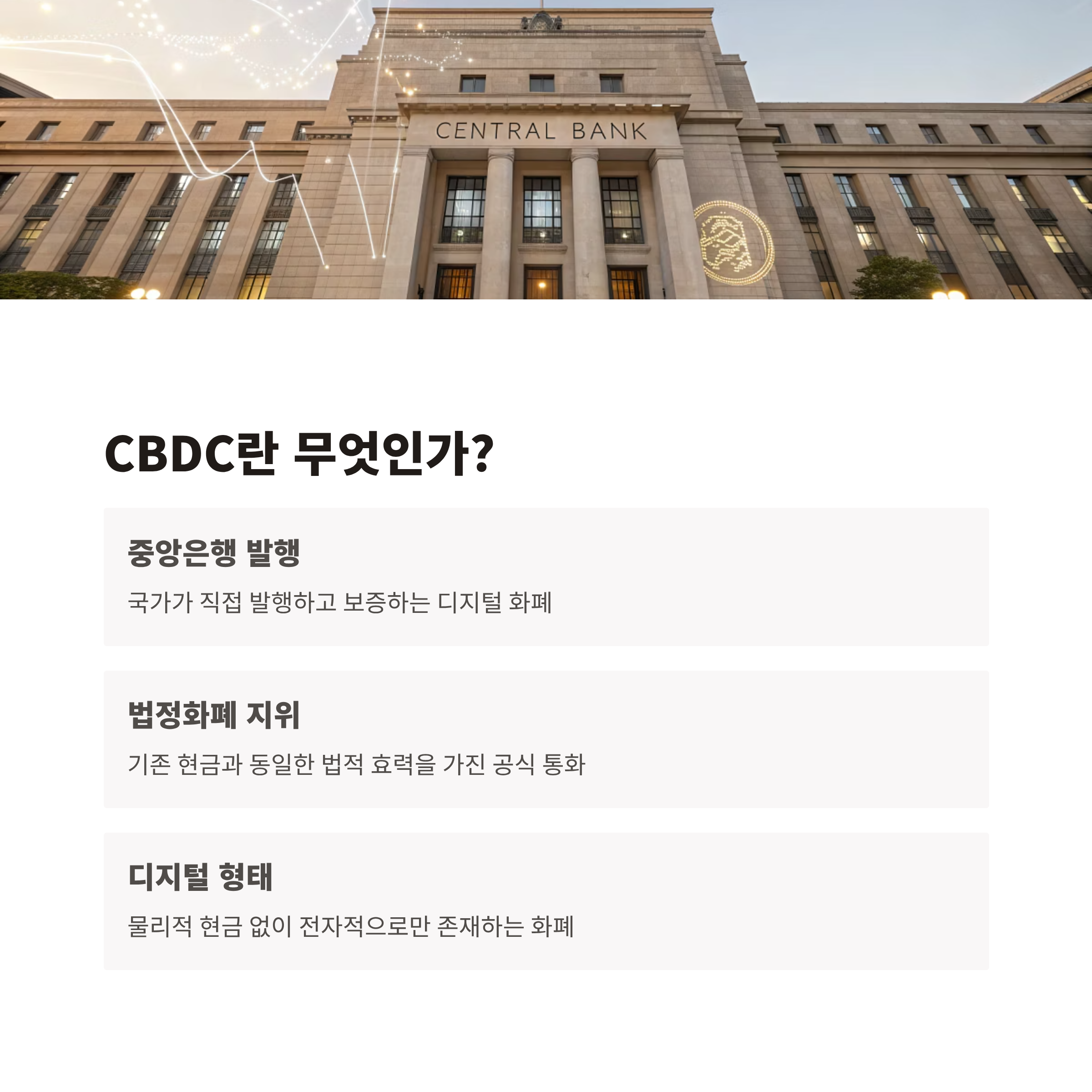 CBDC는 Central Bank Digital Currency의 약자로, '중앙은행이 발행하는 디지털 화폐'를 의미해요. 말 그대로 우리가 아는 종이돈(현금)을 디지털 형태로 전환한 거죠. ‘디지털’이란 단어 때문에 암호화폐랑 헷갈릴 수 있는데, CBDC는 국가가 직접 관리하고 발행하는 법정 통화라는 점이 달라요. 쉽게 말하면, 지금 여러분 지갑에 있는 1만원짜리 지폐를 휴대폰 앱에서 똑같이 쓸 수 있는 전자화폐로 바꾸는 거예요.