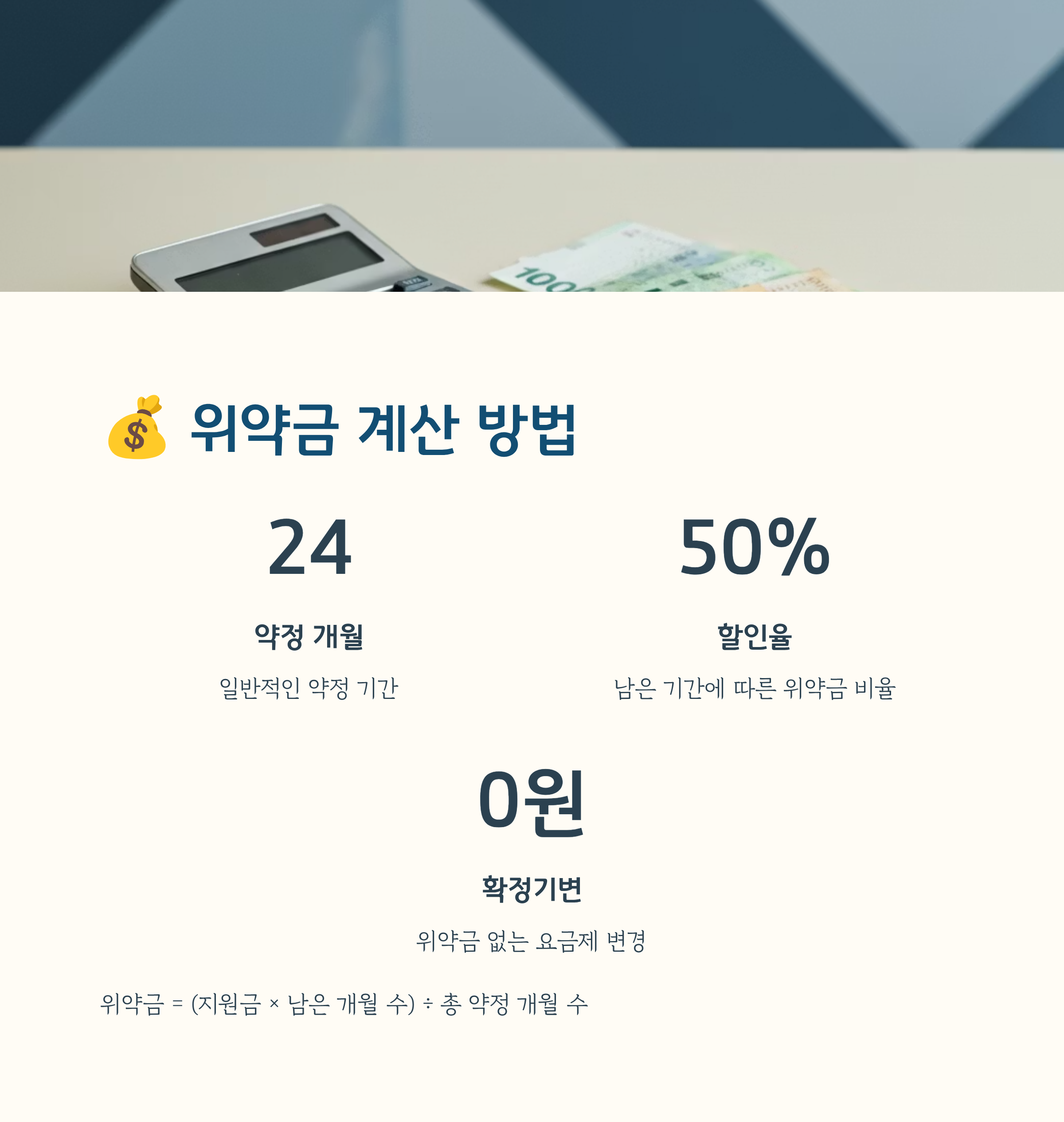 위약금은 일반적으로 '지원받은 금액 ÷ 총 약정 개월 수 × 잔여 약정 개월 수'로 계산됩니다. 약정 기간 중 6개월이 경과하면 위약금 감소 시점이 시작됩니다.