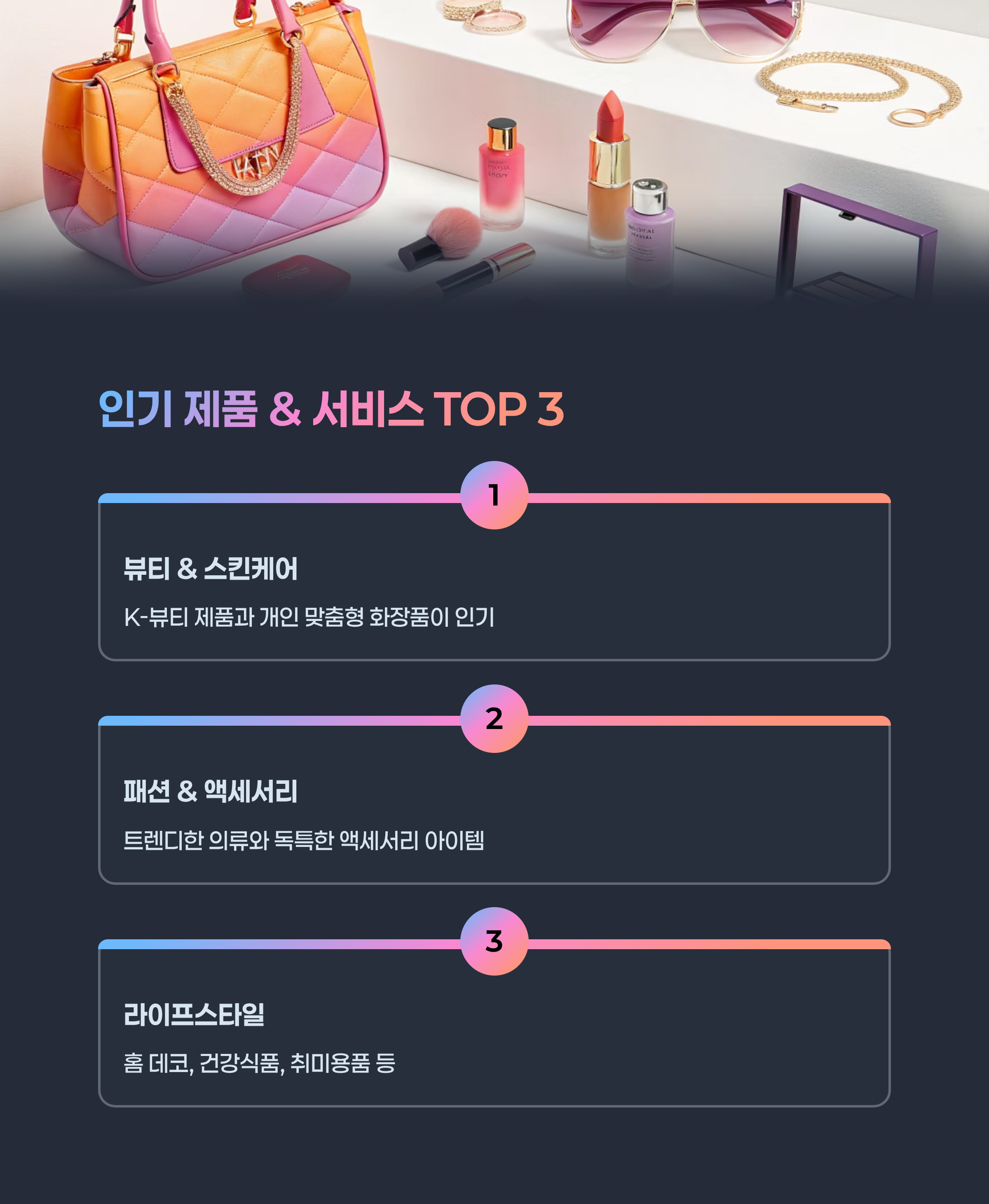 - 뷰티 & 코스메틱: 피부 타입별 맞춤 솔루션을 제공하는 스킨케어, 개성 있는 색조 메이크업 제품, 친환경 비건 화장품 등 개인의 취향과 가치를 반영한 제품들이 주목받습니다. 인플루언서가 직접 사용하는 모습이 구매를 유도합니다.