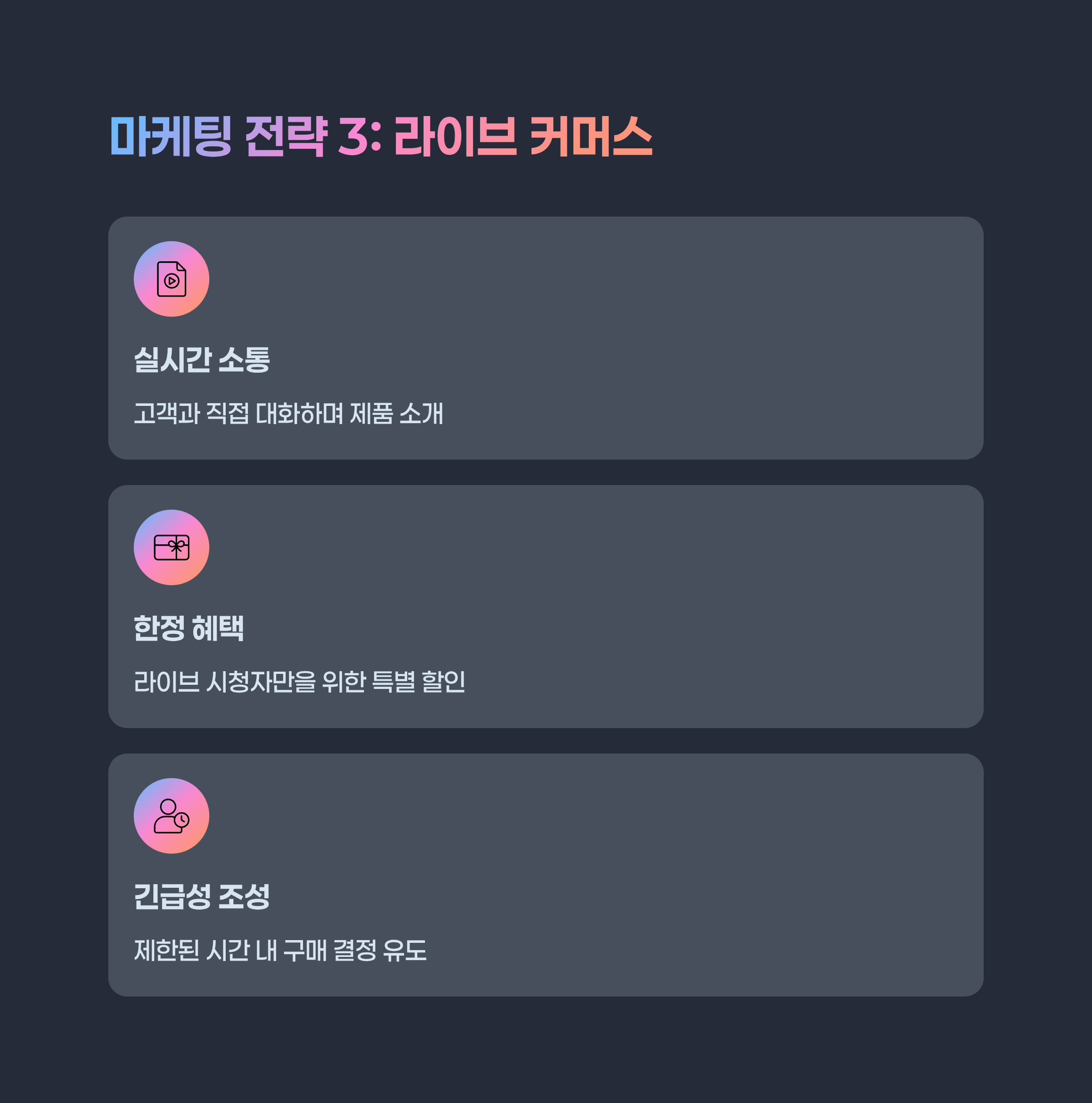 - 실시간 라이브 커머스: 라이브 방송을 통해 제품의 실물, 착용샷, 사용법 등을 생생하게 보여주고, 실시간 Q&A를 통해 고객의 궁금증을 즉시 해소합니다. 한정 할인 등 라이브 특가로 구매 전환율을 높입니다.