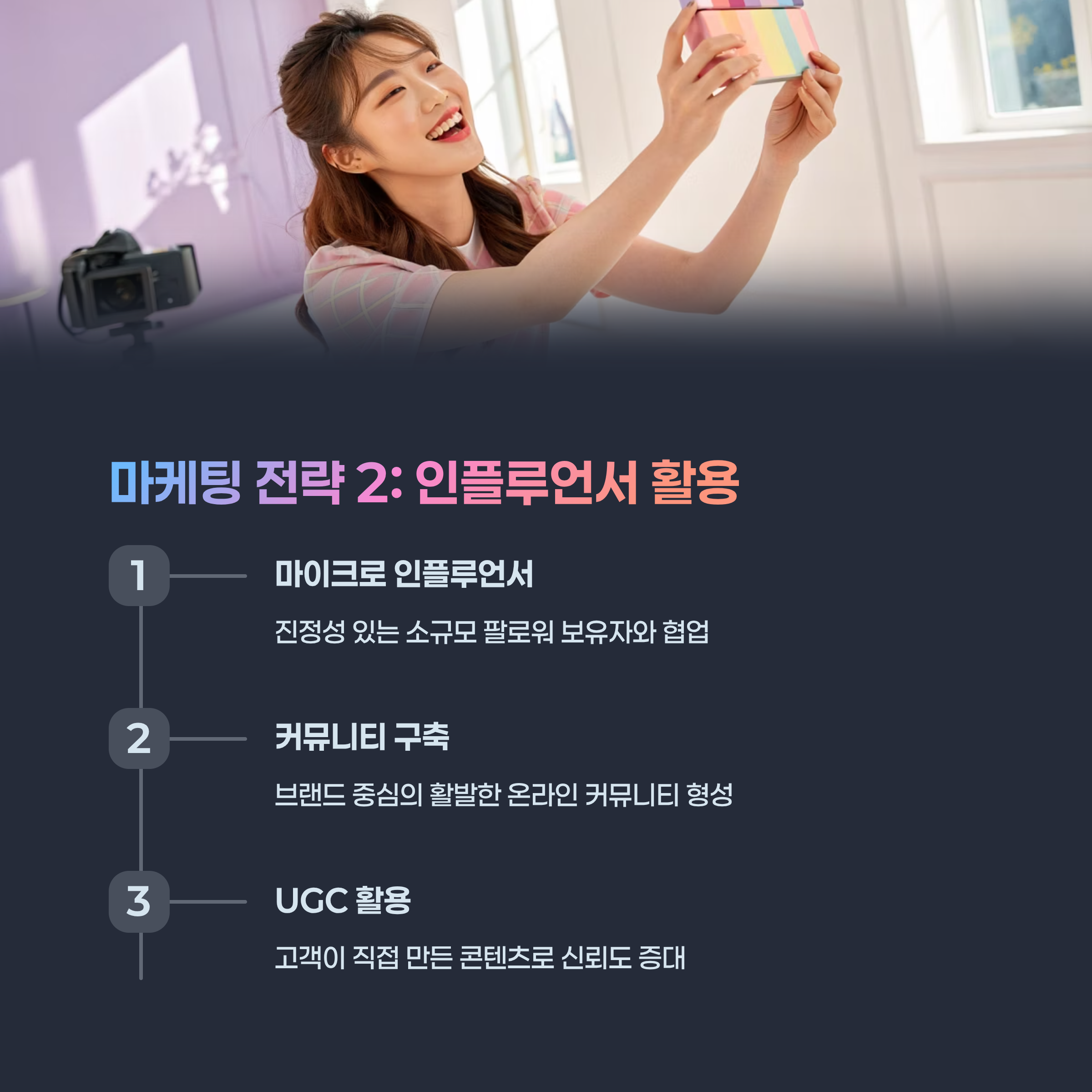 - 마이크로/나노 인플루언서 협업: 팔로워 수는 적지만 특정 분야에서 높은 전문성과 신뢰도를 가진 마이크로/나노 인플루언서와의 협업은 타겟 고객에게 더 큰 영향력을 미칠 수 있습니다.